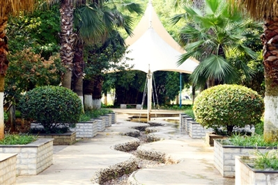 沿着入口处的小路前行,园内,凉亭错落在树荫下,大理石步道蜿蜒曲折延伸至各个角落,人造小溪静静地流淌着,休闲椅、路灯等设施齐全。走进这里,会让人忘记城市的喧嚣,看着满眼的绿意,吹着微微的凉风,和人聊上几句,一整天的暑气都消了。广场中央,一个“四海咸宁”的雕塑成为这个游园的标志性建筑。