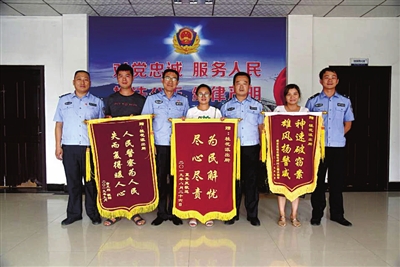 10日,刘家桥3位村民兴高采烈地来到桂花派出所,送上“人民警察为人民,失而复得暖人心”“为民解忧,尽心尽责”等锦旗。 通讯员 吴剑 摄