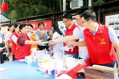 近日,崇阳县人民医院组织20名党员志愿者,来到铜钟乡大岭村社区开展党员志愿者义诊活动,免费为群众提供医疗服务,派发药品和健康宣教。