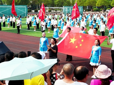 是日上午9:40,崇阳分会场340多对舞蹈爱好者欢聚大集中学足球场,参加升国旗仪式,齐唱《没有共产党就没有新中国》《团结就是力量》,与全球百城千队十万人齐跳《兵兵三步踩》挑战吉尼斯世界纪录活动开始。活动中,来自大集广场、天城广场、金泰广场、中津州中津村等10支舞蹈队参加、680多位舞蹈爱好者伴随着欢快的音乐翩翩起舞,铿锵有力,舞靓天城。