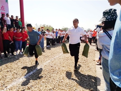 在剧院主席台下30米鹅卵石跑道上,提水抗旱保苗赛正激烈进行,赛道四周挤满了围观加油的人们,那神情仿佛比自己参赛还紧张。