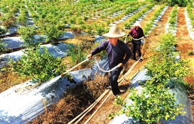 持续的高温少雨,导致该基地果苗严重缺水,部分果树叶已枯黄,为缓解旱情,减少损失,公司每天组织运水车从水塘搬水,给120亩蓝莓果苗浇水解渴。