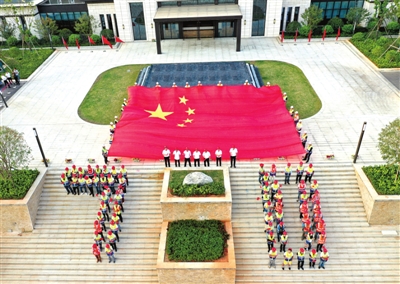 | ▲中建三局投资发展公司东南分公司的百余名施工人员在大洲湖项目部祝福祖国。咸宁日报全媒体记者 向东宁 摄 |