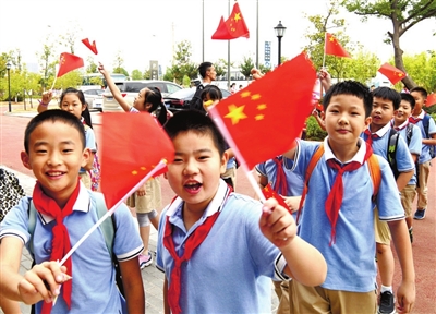| ▲26日,梓山湖航天科技馆,学生们手拿红旗,表达爱国之情。咸宁日报全媒体记者 陈红菊 摄 |