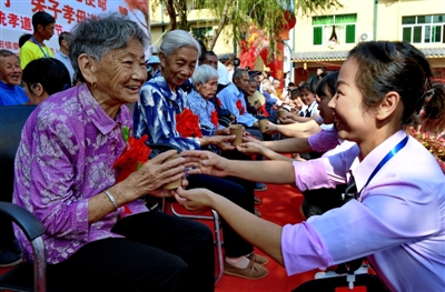 10月7日,晚辈在敬老节活动现场为老人敬茶。