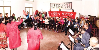 10月7日重阳节,嘉鱼县鱼岳镇北街社区,40多个独居老人欢聚一堂,挥舞国旗满怀深情地同社区文艺队一起唱响“我和我的祖国 ”,现场氛围其乐融融。