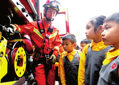 10月15日,消防员为幼儿园小朋友讲解消防车专用器械的使用方法。