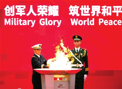 10月16日,国际军事体育理事会主席赫尔维·皮奇里洛(左)点燃第一支火炬。