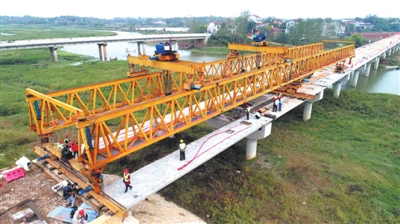 10月15日,咸安区淦河流域官埠窑咀大桥工地上,工人们正在吊装最后一片箱梁,这也标志着该座大桥正式合龙。