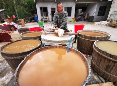 11日,崇阳县天城镇河田村村头,村民们趁着晴好天气,在家门口制作红薯粉。
