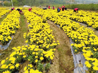 本报讯 记者吴文谨、通讯员吴剑、张璐报道:近日,在咸安区桂花镇万寿桥村,群众们正在采摘菊花,脸上露出灿烂的笑容。