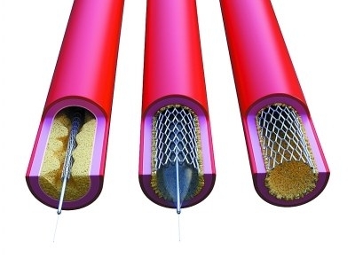 二、支架治疗。冠脉支架经历了从裸金属支架、药物洗脱支架到生物可降解支架的发展。支架植入术的原理是:把支架套在一根顶端有充气球囊的导管上,从手腕的桡动脉或大腿根部的股动脉血管处输送到动脉堵塞的部位,然后给球囊充气以打开支架,最后再把带有球囊的导管放气移出。固定在血管里的支架,可对血管形成支撑、疏通。目前,临床应用较广的是药物洗脱支架。而生物可降解支架作为新一代研发的支架,被誉为“冠脉介入治疗的第四次革命”,其基质骨架及药物载体涂层均由生物可吸收材料制成,在植入人体后,会经过血运重建、支架降解吸收和血管修复3个阶段,3年左右可被人体逐渐吸收。但现在大多数产品仍处于临床试验阶段,缺乏远期随访结果,还需要进一步的观察才能成熟运用到临床中。