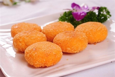 锅内倒入适量的植物油,放入南瓜饼,小火煎至两面金黄。出锅后的南瓜饼放在厨房餐巾纸上吸走多余的油即可装盘食用。