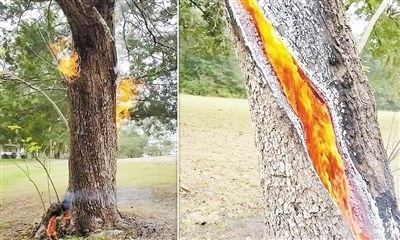 在雷电暴雨天气中,美国得克萨斯州一棵大树被闪电击中。树干被劈开,内部起火燃烧,犹如熔岩流动。