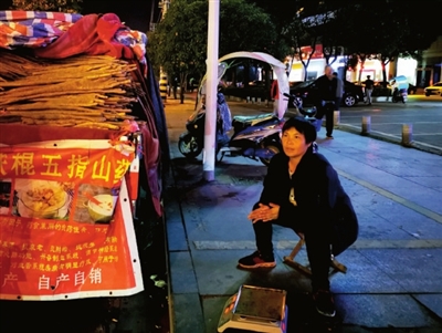 “卖山药,正宗的河南铁棍五指山药。”19日晚7点,记者来到摊前时,李小慧正坐在一个小马扎上吆喝着。