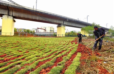 21日,武广高铁高新区横沟桥镇段,工人们正在平整土地种植草皮。据了解,为美化“高铁、城铁、普铁”沿线环境,该镇对涉及“三铁”沿线的突出问题集中整治,拆除违章房屋、破旧房屋、砂石料厂等13处,对裸露的黄土栽树种草。目前,已完成部分整治点,整治工程正在稳步推进中。