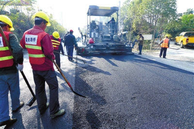 11月22日,嘉鱼县S359石铁线(原嘉泉线)丁家曾大桥至工业大道路面大修工程正进行路面刷黑。该工程于今年9月中旬开工,全长5.906公里,设计等级为二级公路,设计时速为每小时60公里,预计12月底全线完工。