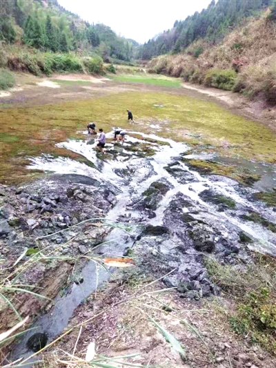 “你看那里。”钟良宇指着水塘下方,一处一米来高的水泥拦坝说,那是很多年前,村民为阻挡漏水而建的。在那下面放一个水桶,十来分钟就能接满满一桶水。旁边的田地,不用浇灌,每天都是湿漉漉的。