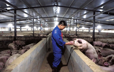 11月28日,在四川省德阳市中江县一生猪养殖场,工作人员检查猪的生长情况。