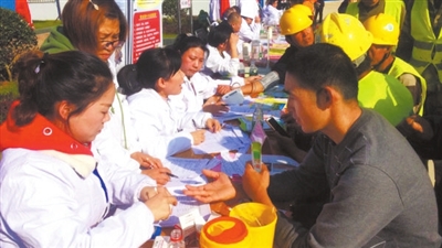 22日,赤壁市维达力三期建设工地,该市卫健部门组织的义诊人员正在给工人们体检。据了解,自第二批“不忘初心、牢记使命”主题教育开展以来,赤壁市卫健局结合工作实际,开展“健康宣教义诊进工地”活动,让工人们不出工地就能享受医疗服务和健康教育,提高工人们的健康意识和防病意识。 通讯员 王小军 摄