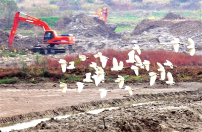 29日,咸宁向阳湖国家湿地公园,挖机正在作业,白鹭飞翔觅食。
