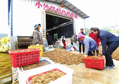 11月28日,崇阳县港口乡小沙坪村,劲松中药材就业扶贫车间门前,村民在晾晒中药黄精。