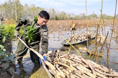 11月28日,嘉鱼县陆溪镇鸭儿湖养殖专业合作社野藕基地,村民袁启星正在挖野藕。