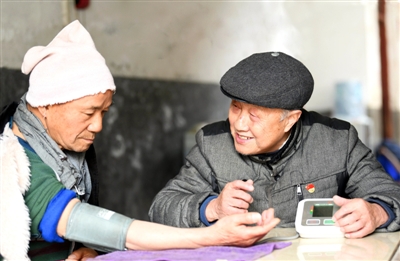 3日,崇阳县天城镇大集社区,80岁的老党员洪应谷上门为龙背村中风老人陈汉桥免费测血压,此行动已经坚持9年。