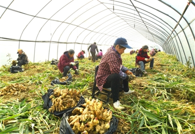 9日,咸安区双溪桥镇杨堡村咸宁致远种植专业合作社大棚内,村民正在收获生姜。