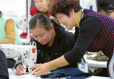 12月15日,在昭苏县洪纳海镇,老师为参加培训班的农牧民讲解缝纫技巧。