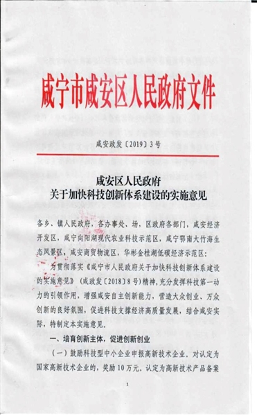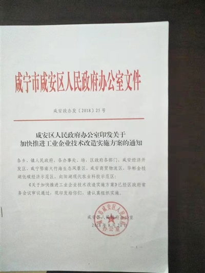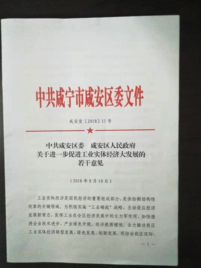 落实政策,营造优质营商环境。区委区政府持续开展优化营商环境专项整治行动,启动营商环境第三方评估,加大对政策法规落实、政务窗口服务质量、部门涉企服务效能等方面问题整治力度。严厉打击金融诈骗、制假侵权等破坏市场秩序、影响发展稳定的行为,维护市场主体合法权益。建成“互联网+放管服”政务服务体系,推行“马上办、网上办、一次办”。编制证照清单通用目录,持续开展“减证便民”行动,推行多规合一、多审合一、多评合一、多验合一、多证合一,最大限度提高办事效率。在开发区试行产业项目“先建后验”,除环保、安监领域规定要件审批外,在更大范围、更广领域推广容缺审批服务模式。2019年又制定出台了《咸安区人民政府办公室关于进一步加快推进工业企业技术改造工作的通知》,将每年的区级技术改造资金由1500万提高到3000万元以上;将奖励标准由5%提高为10%;最高奖励标准由300万提高为600万元,从而进一步引导全区企业开展技术改造。
