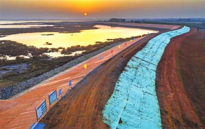 16日,无人机拍于赤壁市黄盖湖防洪治理工程。