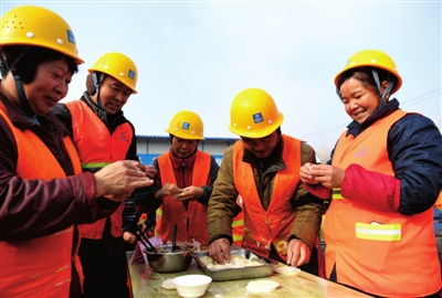 12月22日,农民工在合肥聚变堆项目工地上包饺子。