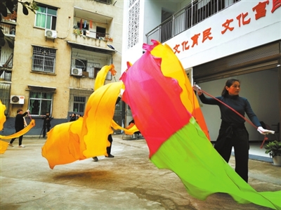 院外社区大妈们正随着音乐欢快地舞着五彩“绸龙”。二楼的诗书画室里,下象棋、写书法,大爷们忙得不亦乐乎。一庭院子,三层小楼,文化站虽然面积不大,但书房、阅览室、多功能排练厅、诗书画室、戏曲室、音乐室、舞绸龙协会等“三室一厅一场”标准建设一应俱全。