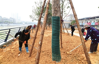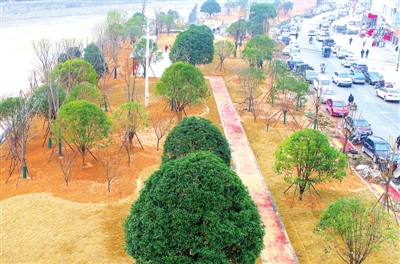 日前,工人们在通城县柳堤滨河公园进行植绿。柳堤滨河公园项目是通城县迄今为止单项投资最大的景观生态工程,占地132亩,总投资9000余万元,计划2020年元旦开园。