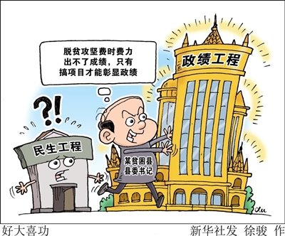 有关专家认为,脱贫攻坚战到了最后时刻,必须警惕好大喜功的政绩工程。地方领导干部尤其是党政“一把手”,要有正确的政绩观,踏踏实实抓利民惠民的实事,抓小抓细,务求实效;切忌好大喜功、华而不实。
