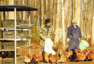 1日,嘉鱼县新街镇港东村林下养鸡场,饲养员在林间给鸡喂食。