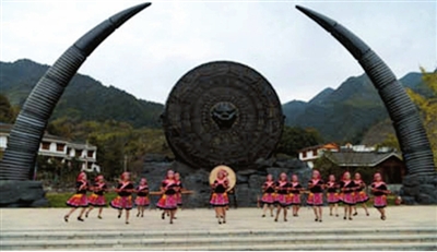 昨日,湖北省通城县大坪乡内冲村遥望千年广场,一支穿着瑶族盛装的队伍正在表演拍打舞,游客拍照欣赏。