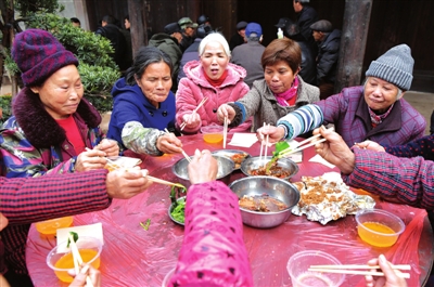 当日,江西省南昌市南昌县冈上镇蚕石吴家村邀请住在本村及外出多年的400余位60岁以上的老人共聚一堂,同吃“敬老饭”。据了解,蚕石吴家村每年春节前都要举办“敬老饭”活动,目的是为了表达对村中老人的关怀与敬重。
