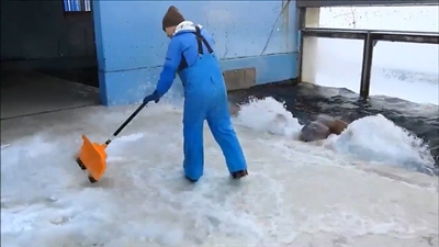 近日,北海道小樽水族馆两只海象用前鳍从池中泼水帮助饲养员除雪,这两只海象名叫Uchio和Ulya,长约2米体重1300公斤。饲养员德山渡称有它们的帮助除雪效率提高了一倍,但人也被淋湿了。