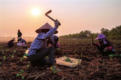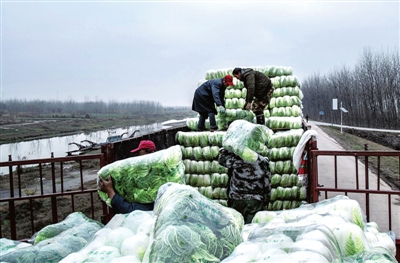 1月9日,嘉鱼县新街镇茅洲脑村的菜农正在地里收割大白菜,长江堤上排着很多来自内蒙、新疆、山东等地的菜商车辆。与此同时,一些菜农正在种植下一季白菜。