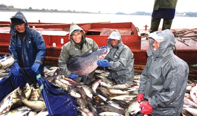 1月7日,嘉鱼三湖连江水库的小湖正在起鱼,排水降至施工水位,标志着嘉鱼县滨江生态提升示范工程小湖综合整治工程启动。