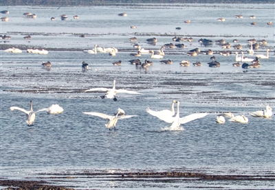 据向阳湖国家湿地公园管理处监测数据显示,近期气温持续偏低,从北方飞临斧头湖越冬的候鸟数量近期已达近万只,其中小天鹅900余只,白琵鹭200多只,红嘴鸥5000多只,并新发现国家一级保护鸟类白鹤6只。