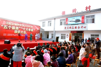 1月19日,咸宁市崇阳县铜钟乡在佛岭村文化广场上举办2019年度“五个最美”“十大孝星”颁奖大会,对李凤梅等20位村民进行表彰。