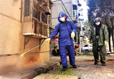 29日,咸安区温泉街道办事处卫生防疫人员在金叶社区喷洒消毒水。为切断新型冠状病毒传播渠道,我市各地积极组织卫生防疫人员深入社区道路、楼院、市场、便民服务中心等公共场所及重点区域进行消毒,全面保障人民群众健康安全。