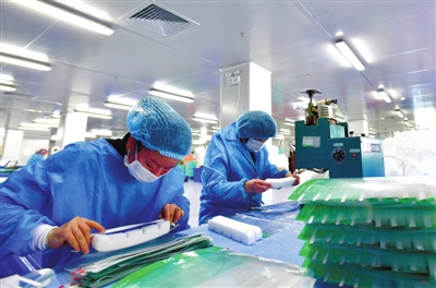 2月18日,市高新区兆舒美防护用品有限公司车间,工人们正在加紧生产防护用品。