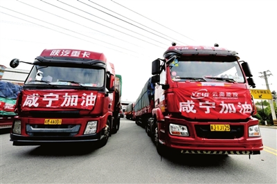 23日上午10时,54台装满云南爱心物资的大货车顺利抵达咸宁。