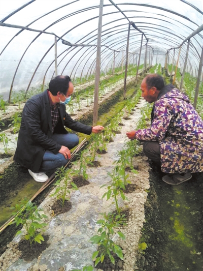7日,通城县公共检验检测中心驻五里镇锡山村工作组成员徐俊,在村蔬菜基地指导菜农友景松加强辣椒苗管理。连日来,通城县185个驻村防疫工作组在继续抓好疫情防控工作的同时,活跃在田间地头,开展送政策、送技术、送岗位“三送”活动,力争将疫情损失降低到最低程度。 通讯员 杨红斌 摄