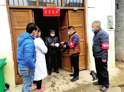 “出门戴口罩,不要到处跑!” “金书记又在喊话了,他每天要巡回跑几次,不是宣传就是送物资!” 疫战爆发以来,金勋以驻村第一书记的身份于元月25日快速赶到白骡村参加疫情防控工作。元月27日组成专班成立由驻村工作队,驻村干部、村两委班子、村民小组组长、入党积极分子组成四个防控专班,形成“人人身上有担子、个个心中有责任”防控机制。他开着宣传车到各村民小组宣传上级命令,带领工作队员、村干部到各组张贴宣传资料,督促村民不打牌、不聚餐、不串门、戴口罩、净环境。特别对武汉返乡、途经人员进行地毯式排查,并对17日后从武汉返乡60人进行“九个一”管控,他带着工作队、村干部每日进行随访,建立微信联系群随时掌握动态,登记居家监测人员身体体征情况,发现问题及时处置。同时,金勋坚持值守3个卡点,他作为团长还要组织9名工作队员到全镇22个村(社区)巡回督查,一有空对群众进行防控知识讲解,疏导居家隔离监测人员心理。他在守卡时劝回因夫妻吵架离家出走的村民,对困难群众不厌其烦、有求必应,多次为孤寡老人、留守老、残疾不便老人买药送到手中。