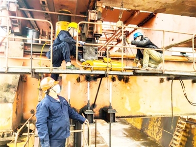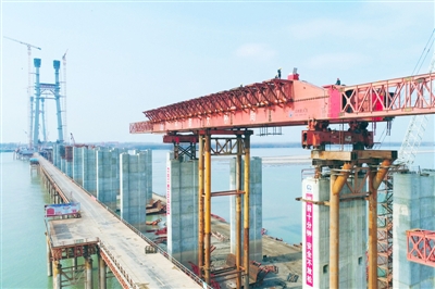 截至3月15日,项目公司人员返岗率已超过50%,现场复工面已超过70%,钢主梁、斜拉索制造和钢主梁涂装等单位全员返岗。大桥南北主塔、墩顶三节间主梁架设、滩桥移动模架施工、乌林互通现浇、南岸小箱梁架设等作业面已全面复工。通讯员 周漓 摄